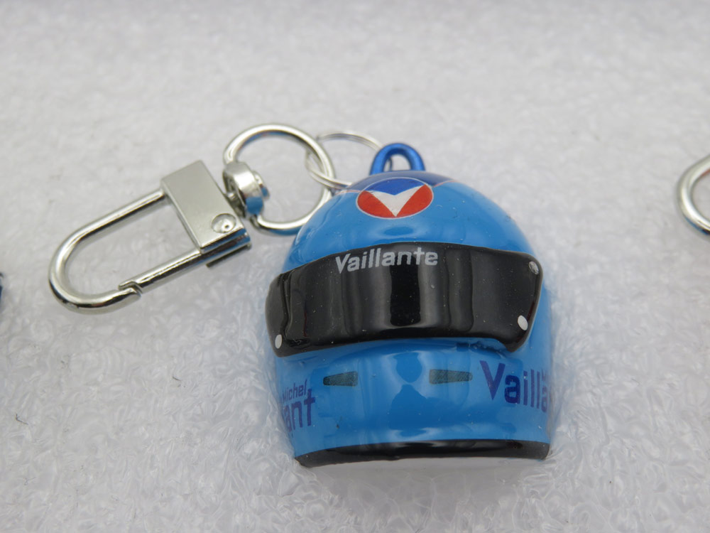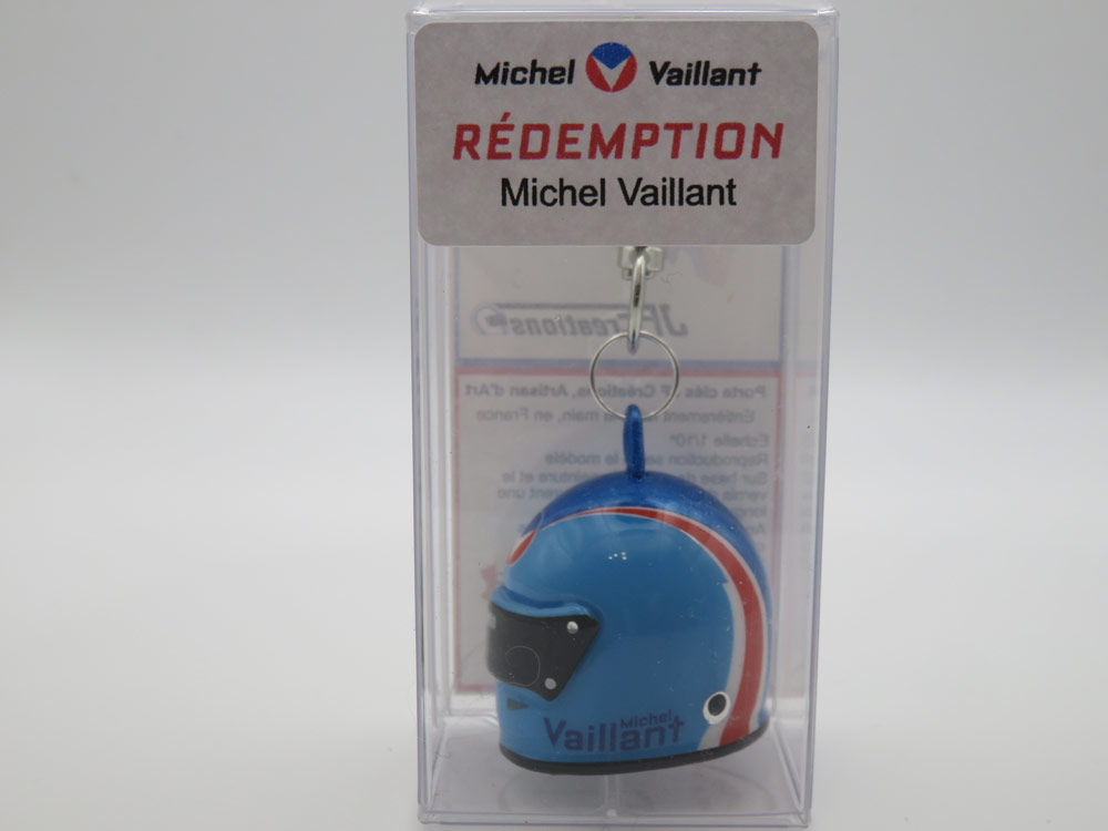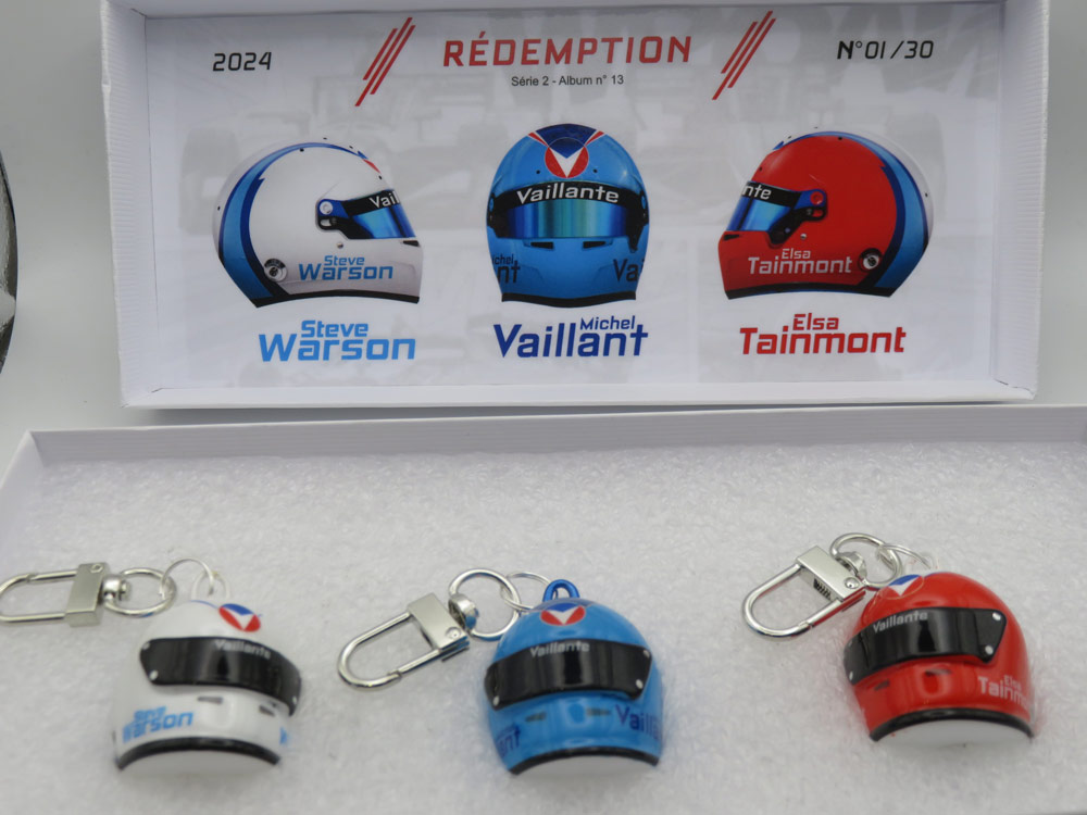 Les nouveaux casques de Michel Vaillant, Steve Warson et Elsa Tainmont sont disponibles en version mini-casque au 1/12ème et en porte-clefs.